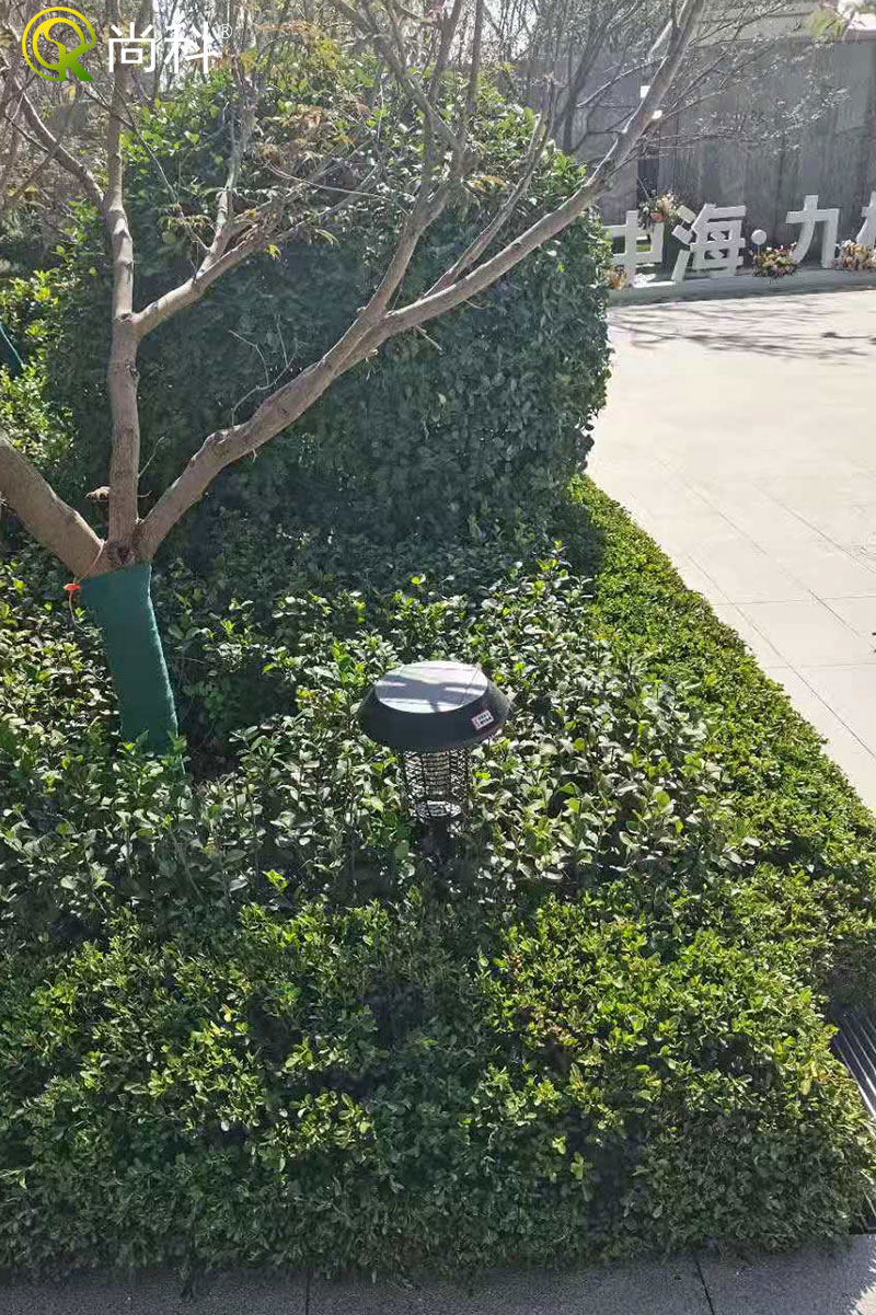 太陽能小區滅蚊燈直接插在綠化(huà)帶裏麵。不足之處(chù)是樹木遮擋了太陽能板