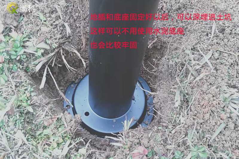 上圖:安裝師傅(fù)很有經驗,把地插跟底座連接後插(chā)在土坑(kēng)裏,既牢固又美觀,還省事省力,不用水泥底座