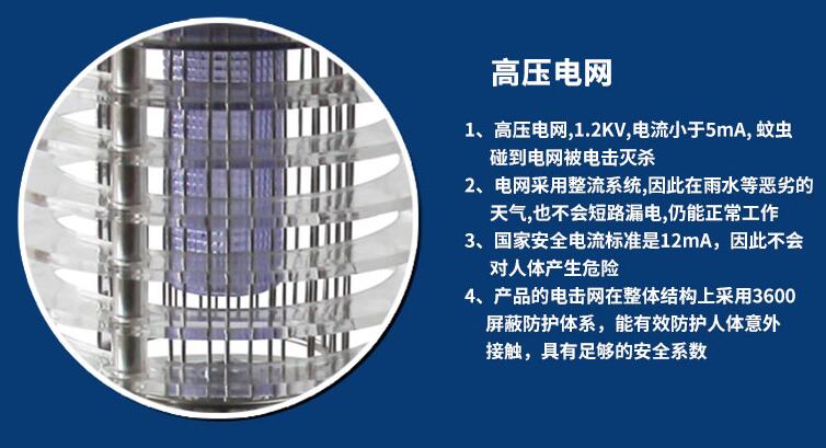 上(shàng)圖:室外滅蚊燈MW-5A高(gāo)壓電網1.2kv,蚊蟲碰到即可被殺死