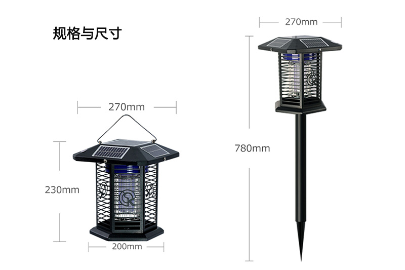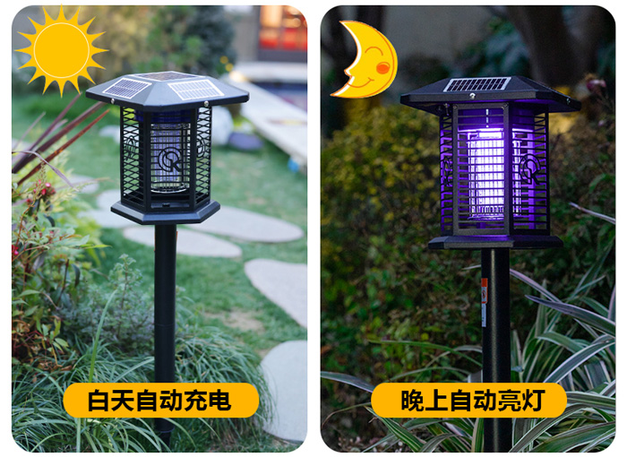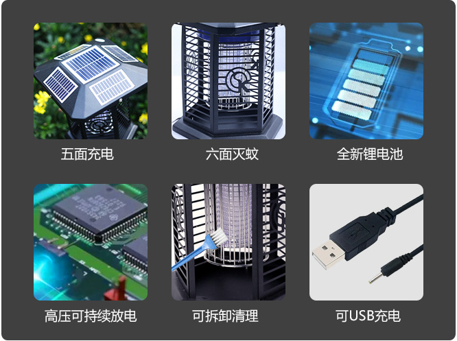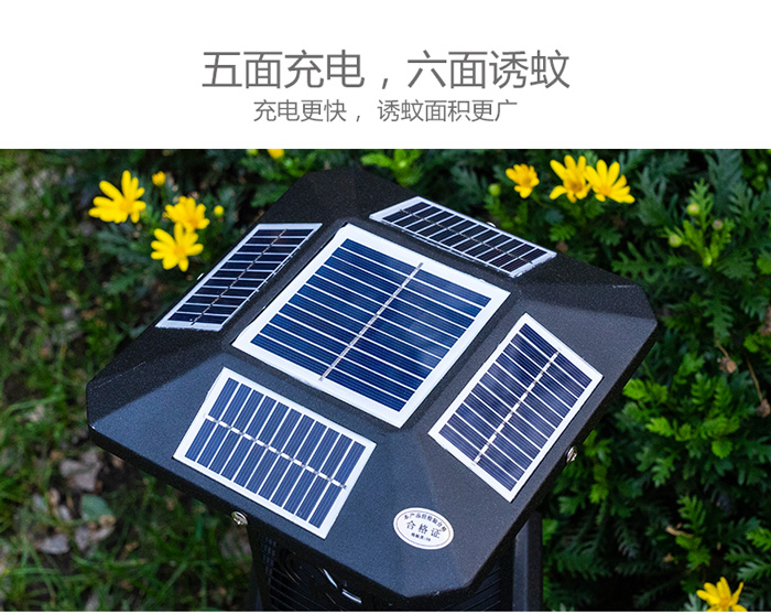 3、五麵太陽能板,充電更快。六麵誘蚊電網(wǎng),麵積更廣。
